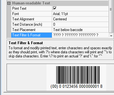 There are special considerations for using OnMerge Barcodes for barcodes like the one below beginning with a few digits in (parentheses) which are part of the GS1-128 family. GS1-128 barcodes go by many names, such as SSCC-18, SCC-14, GLN, and GTIN. NB Beware! You may see references to GTIN-8, GTIN-12, GTIN-13, or GTIN-14 (instead of just plain GTIN), but those something else entirely. They're other names for EAN-8, UPC-A, EAN-13, and 2 of 5 Interleaved (ITF-14), respectively. OnMerge Barcodes can also produce those. NB SCC-14 data can be placed in either UCC EAN128(GS-128) or 2 of 5 Interleaved (ITF-14) barcodes. If you need the style that begins with (01), use the instructions on this page. If you need the style with no (01) [and probably bars or a box around the barcode], use 2 of Interleaved and make sure to select the Generate Check Digit option. Don't use Code 128 for these -- use UCC EAN128 If you receive specifications from a trading partner which either a) call for GS1 barcodes, b) show a sample 1-dimensional barcode like the one above beginning with a few digits in parentheses, or c) call for a Code 128 barcode beginning with "FNC1" or "Function Code 1," DON'T USE REGULAR CODE 128 as your Barcode Type. Use UCC EAN128 instead. UCC EAN128 is a special sub-type of Code 128 barcodes which automatically includes the invisible FNC1 indicator in the barcode, and which has special processing/verification rules to deal with parentheses and generate checksums in certain cases. Entering Data The leading digits in parentheses such as (00) are called the Application Identfier. They identify the meaning and format of the digits that follow. The barcode data you enter or retrieve from a database must include the () characters around the Application Identfier, immediately followed by all the data digits. No blanks or punctuation. OnMerge will remove the parentheses from the barcode's internal representation, but needs the parentheses to verify the data's format. Certain Applications such as SSCC-18 (Application Identifier 00) may call for a checksum as the last digit. OnMerge Barcodes will compute the checksum for you automatically, BUT you must include a "dummy" digit such as zero where the checksum is supposed to appear. OnMerge Barcodes will silently change the dummy digit to the correct value. Adding spaces between the digits of human-readable text Some trading partners may specify spaces between certain digits in the human-readable text. Unfortunately, the rules for placing the blanks varys significantly, even for a given Application. Given this, OnMerge Barcodes shows the human-readable text as a solid block of text by default. For example, this SSCC-18 shows up as You can easily add blanks in specific places using the Text Filter & Format option on the Barcode Setup tab. Enter a ? for each data digit (including the parenthesis characters) and a space wherever you need to insert one. The Format for the example above would be