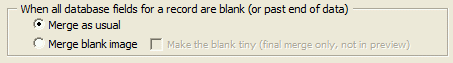 Setting the Empty-Record Behavior If a barcode data formula contains one or more database field lookups, all of the referenced database fields for some records may be completely empty or blank. You may also see some phantom empty "records" beyond the end of the database on the last page of a series of labels. The missing fields may cause the barcode data to be invalid or blank, in which case OnMerge Barcodes will fall back to the behavior that the "unavailable or invalid" option specifies. The regular "unavailable or invalid" option is fine for many applications, but some applications require one kind of action for truly missing or invalid barcode data but need a blank in the case where all referenced fields in the database record are empty/blank. NB when you're printing several records per page — for example a 2 x 4 page of name badges — you'll usually have one or more excess blank badges at the end of the last page. Those excess badges correspond to non-existent records beyond the end of data, but Word will nonetheless try to merge each excess badge with a fictional blank data record. That can look messy. Use the Merge Blank Image option to blank out the barcode for exess badges. Click the Merge Options tab in an image's OnMerge Barcodes dialog to access the empty-database action frame. Select one of the buttons to indicate what should happen only in the case where all the database fields in the file name formula are empty/blank for a given record. Merge as usual causes missing-image to go on as usual as described above. Merge blank image will make OnMerge use a blank for a given record when ALL the database and address fields in the file name formula are blank or missing. This will occur even if the barcode data formula is a mix of database/address and other types of fields. The Make blank tiny option is available when Merge blank image is selected; it works just like the Make this image tiny option described above. Again, the result of selecting Make blank tiny will show up in final merges only. Word's on-screen preview will not make preview images tiny because they'd be too small to select and edit.