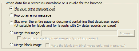 this Popup up an error message causes a dialog box to pop up with details about the invalid data. If you choose to ignore the error, a red "X" icon will be displayed in the image's place. Skip over that database record entirely cancels the merge for that record (row) of the data source and causes the merge process to move on to the next record. Merge this image lets you specify one fixed image to use instead of a barcode with invalid data. When this option is selected, you can enter a file name, or you can press the Browse button to select the file from a list. The Make this image tiny option is available when Merge this image is selected.