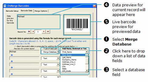 To insert a barcode, the OnMerge Barcodes software must already be installed. Mail Merge Basics The Mail Merge process works with two elements: the master document (or form letter) and with a data source. The data source can be another Word document, a spreadsheet, an Outlook Address Book, a database, or other data source. Whatever the exact nature of your data source, it is always divided into one or more rows, each row containing one or more fields (also known as columns). Word 2007: Comma- and tab-separated (CSV, TSV, Text) data does not work with OnMerge. This is due to a limitation in Word. Word 2010 and later: If your document is in the old (.doc, .dot) format, Comma- and tab-separated (CSV, TSV, Text) data does not work with OnMerge due to a limitation in Word. They work fine with new Word document format (.docx, .docm, .dotx). The Mail Merge process will repeatedly print the master document, once for each row of the source data, but with a twist: you can specify that each copy of the master document must have some of the source data fields inserted into the result at specific places. Since there is a the master document made for each row of the source data, only the data fields from that row are inserted into the corresponding copy of the master document. Setting Up a Mail Merge The master document is a regular Word document, but the data source requires setting up. The easiest way to do that is to use the Mail Merge Wizard: Select Mailings | Start Mail Merge | Step by Step Mail Merge Wizard in Word's Ribbon and follow directions. If the Mail Merge Wizard doesn't meet your needs, access Word's Help and search for "mail merge," or consult a local expert. Inserting an OnMerge Barcode