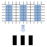 This diagram shows an enlarged view of the printer's grid, with 2-unit wide dark and light bars in blue laid out on it. Because the bars match the grid exactly in this example, the resulting bars shown in black are even. What happens if the barcode's resolution doesn't match the printer The position and size of the dots that make up the printer's grid can't be changed. Furthermore, each dot can only be fully colored (e.g. black) or blank (i.e. white). This forces a hard decision on the computer driving a printer if a barcode being printed doesn't line up with the printer's grid. For example, what if some bars in a barcode are supposed to be 1.75 dots wide? The answer is that there is no "good" choice that the computer can make, so it falls back on some rules of thumb.