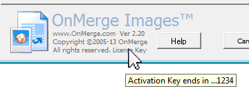 Licensing Terms OnMerge is licensed per workstation. This means that each license entitles you to use OnMerge Images on a single desktop or laptop computer. You'll need multiple licneses if you wish to use the software on, for example, both your home and work computers. In the case of software running on servers (for example Citrix™ servers), the software is licensed per-user. License Management For organizations with multiple OnMerge licenses, hover the mouse over the words License Key at very bottom of the OnMerge Images dialog as shown to see the last few digits of the installed License Activation Key. |